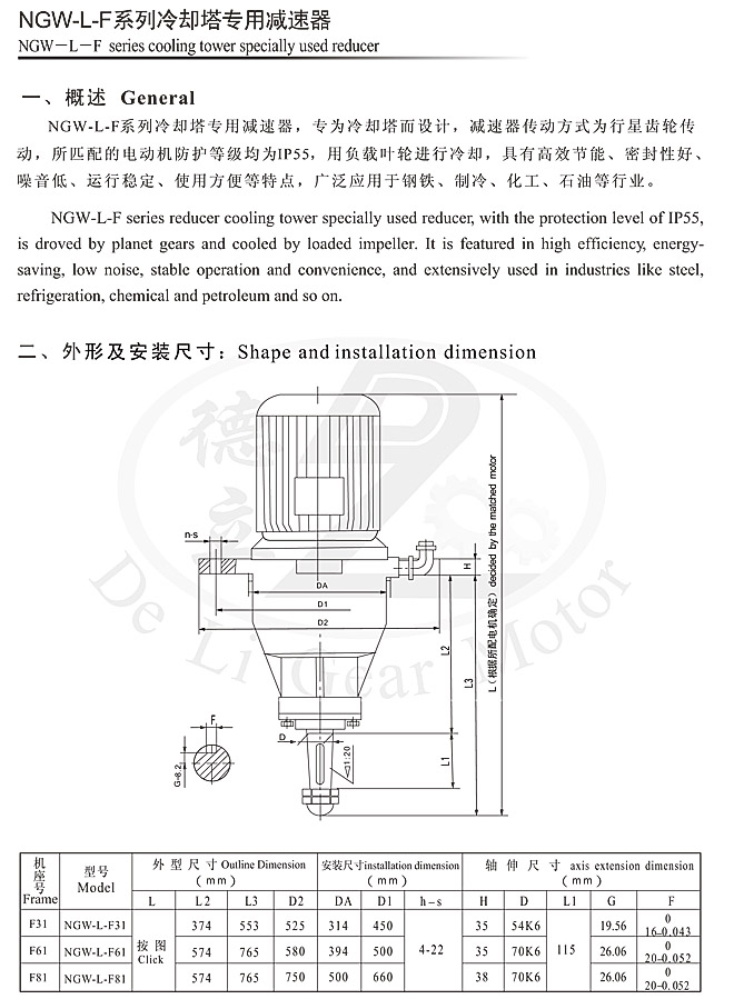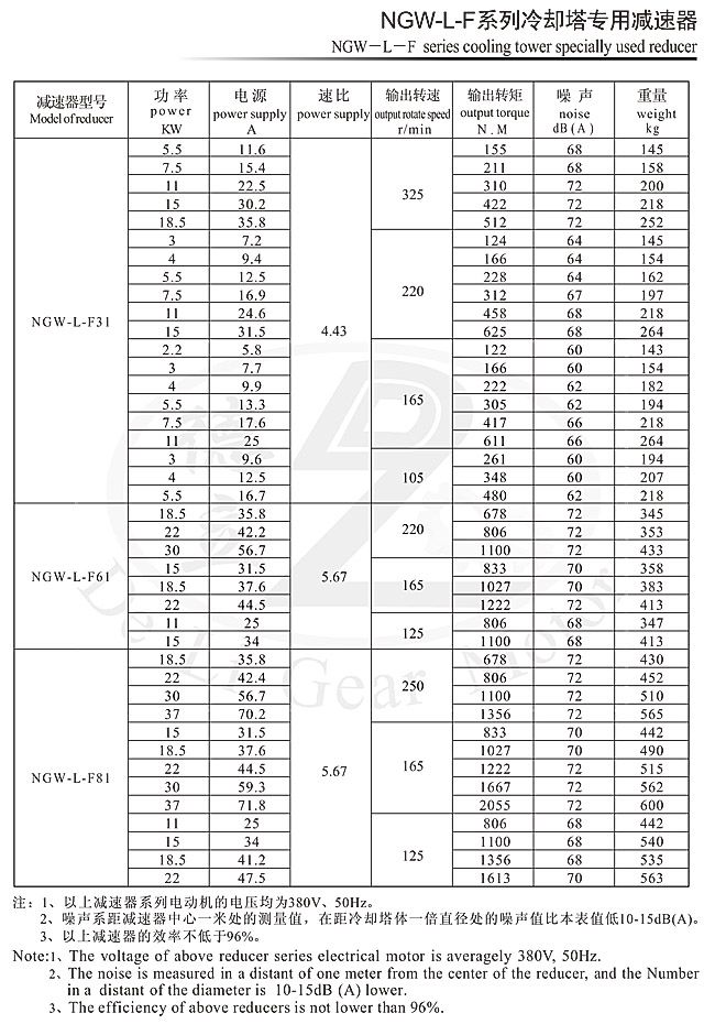 NGW-L-F系列冷卻塔專用減速器系上海交通大學設計,是專門為配套200~750T/n冷卻塔設計的新產(chǎn)品,其主要結構為立式單級行星傳動。齒輪采用合金鋼經(jīng)高精度切削加工熱處理而成,具有強度高、韌性好、精度高等優(yōu)點,同時采用浸油式潤滑,且在密封方面作了改進,從而達到了噪音低、振動小、效率高、不漏油、壽命長的目的。己成為冷卻塔節(jié)能降噪的最理想產(chǎn)品,被廣泛用于化工、輕工、醫(yī)藥、冶金、高級賓館、民用建筑等行業(yè)。